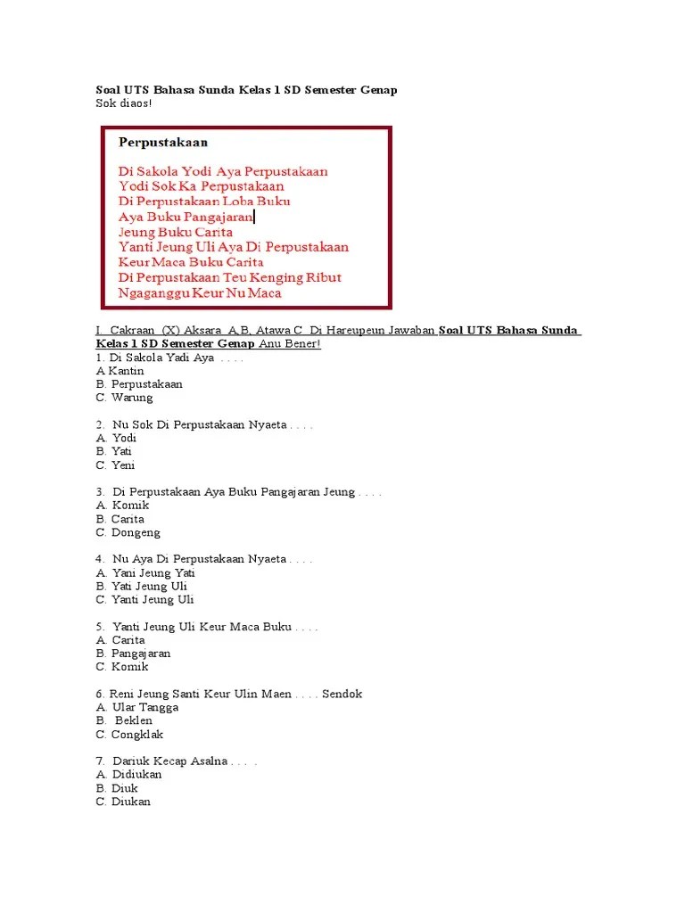 Maksud dari iklan tersebut adalah … a. Baca juga :latihan soal ulangan akhir semester uas 1 matematika kelas 9 smp. Jika belum, yuk langsung saja kita simak contoh soal pilihan ganda dalam. Ulangan tengah semester basa sunda kelas vii i. Soal ulangan tengah semester basa sunda kelas 2 semester 2full description.